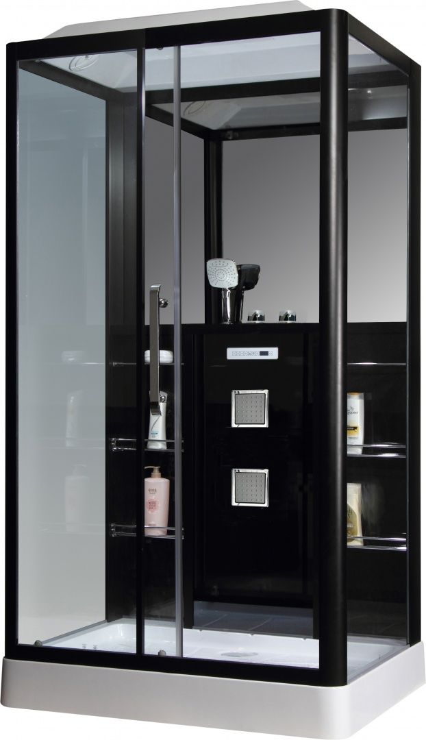 Стильная душевая кабина GR-227 L от немецкой компании Grossman украсит любую ванную комнату и обеспечит максимальный комфорт и расслабление после тяжелого рабочего дня. Трехсекционная конструкция изготовлена из прозрачного закаленного стекла, помещенного в алюминиевый профиль. Задняя стенка выполнена также в черном цвете и оснащена большим зеркалом. Поддон имеет высокий бортик, который препятствует разбрызгиванию воды за пределы душевого пространства. Эффективность водных процедур повышают две горизонтальные гидромассажные форсунки для спины. Сенсорное управление с пультом облегчает настраивание функций: включение радио, подсветки, принудительной вытяжки для создания оптимального микроклимата во время принятия водных процедур. Для размещения принадлежностей и моющих средств предусмотрено три полочки.
