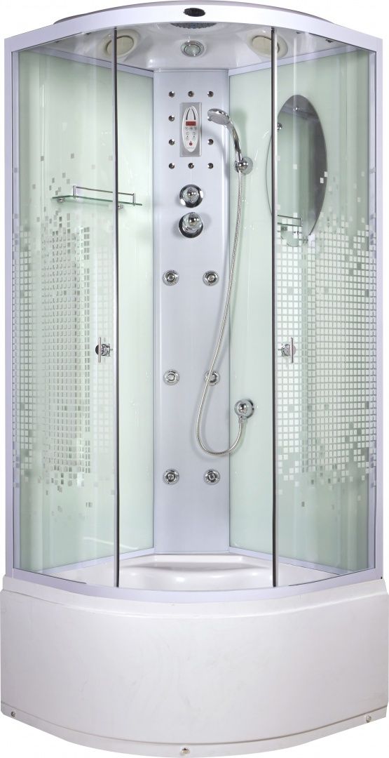 При внешней компактности душевая кабина Niagara NG-309-01N просторна и функциональна. Внутри установлен смеситель, предназначенный для верхнего душа «Тропический ливень», ручной лейки с тремя видами струи и спинного гидромассажа. Удобно расположиться поможет сиденье, а радио и подсветка разнообразят привычные процедуры. Центральная панель производится из пластика, закаленное дверное полотно украшено узором «мозаика». Для быстрого доступа к коммуникациям поддон оснащен съемным экраном.