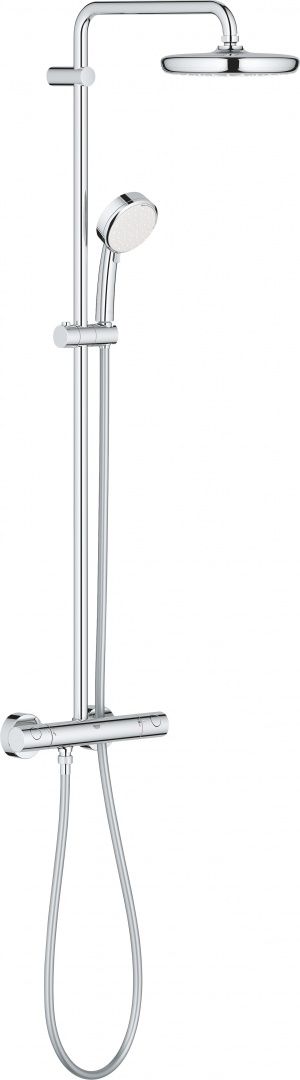Стильная душевая стойка от известного немецкого бренда Grohe выполнена в минималистическом стиле, в котором основной акцент делается на качестве материалов и функциональности. Все металлические элементы изготовлены из высококачественной антикоррозионной латуни, покрытой хромированным слоем Grohe StarLight®. Душевая стойка оснащена двумя лейками: тропическим душем с одним режимом струи – «дождь» (угол наклона лейки ± 15°) и ручным душем с двумя режимами струи – «дождь» и «интенсивная круговая струя». Термостатический смеситель невероятно прост в управлении: плавными поворотами рычагов контролируется температура и напор воды. Технология Grohe TurboStat® обеспечивает стабильную подачу воды заданной температуры, Grohe SafeStop® активирует стопор безопасности при повышении температуры воды до 38 °C.