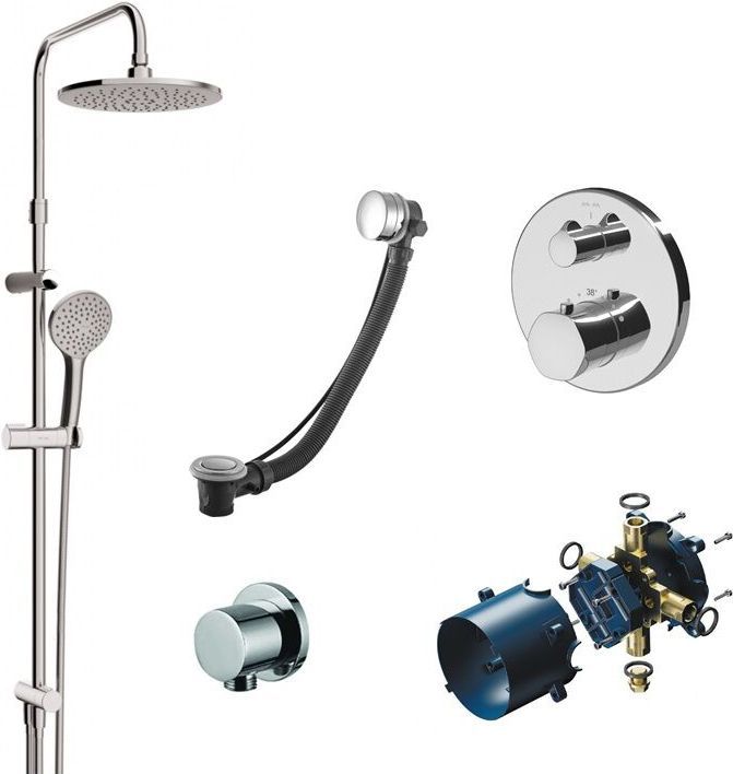состав к-та: верхний душ, душевая лейка, душевая стойка, слив-перелив, смеситель, шланг для душа, шланговое подключение