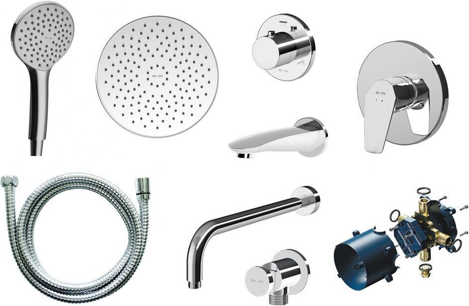 состав к-та: верхний душ, душевая лейка, излив, кронштейн для верхнего душа, переключатель потоков, смеситель, шланг для душа, шланговое подключение