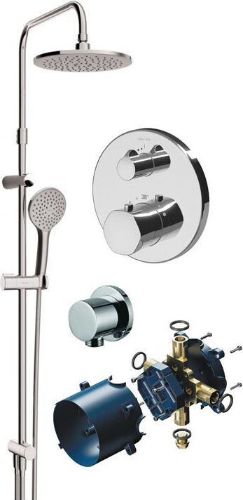 состав к-та: верхний душ, душевая лейка, душевая стойка, смеситель, шланг для душа, шланговое подключение