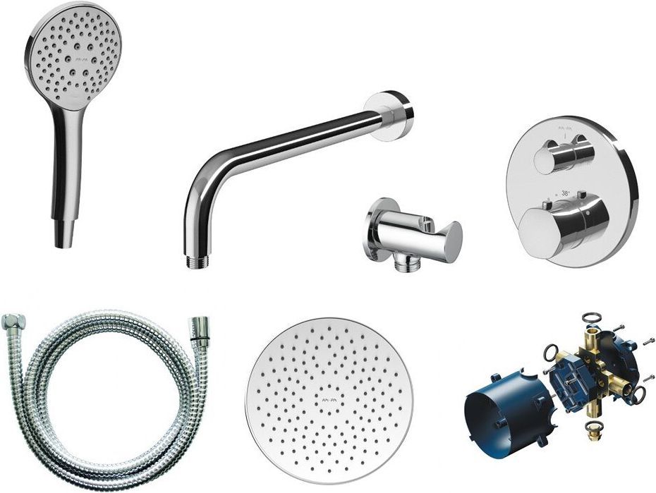 состав к-та: верхний душ, душевая лейка, кронштейн для верхнего душа, смеситель, шланг для душа, шланговое подключение