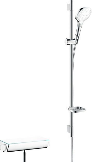Душевой комплект Hansgrohe Ecostat Combi Raindance Select придаст ванной комнате аккуратный вид. В его состав входят термостат и ручная лейка, укомплектованная шлангом и душевой штангой с держателем. Изделия произведены из высококачественных материалов, что обуславливает их прочность и долговечность. Привлекательность гарнитура обеспечивает органичное сочетание износостойких покрытий белого и хромового оттенков. Термостатический картридж предотвращает вероятность поступления слишком холодной или горячей струи из-за перепадов давления в централизованной системе водоснабжения. Ручная лейка доставит удовольствие от водных процедур, проводимых в одном из трех возможных режимов. Пластиковый шланг длиной 160 см не перекручивается, что увеличивает срок его службы. Штанга высотой 90 см позволяет принимать душ даже высоким людям. В комплект входят мыльница и полочка для размещения гигиенических принадлежностей.