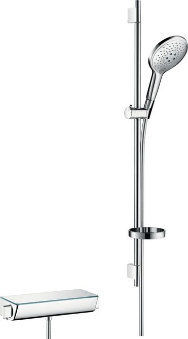 Основное достоинство душевого комплекта Hansgrohe Ecostat /Raindance Select S 150 – единство стиля всех составляющих: термостата и ручной лейки со шлангом и штангой. Хромовое покрытие, которым обработаны изделия, устойчиво к коррозии и потускнению, легко очищается и придает поверхностям зеркальный блеск. Термостатический картридж не позволит обжечься или переохладиться во время скачков давления в централизованной системе водоснабжения. Трехрежимная ручная лейка удобна в эксплуатации благодаря подсоединению к пластиковому шлангу длиной 160 см, продуманная конструкция которого исключает перекручивание. Душевая штанга высотой 90 см комплектуется мыльницей и держателем.