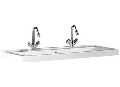 Раковина-столешница с двумя отверстиями под смесители. Полотенцедержатель приобретается отдельно.