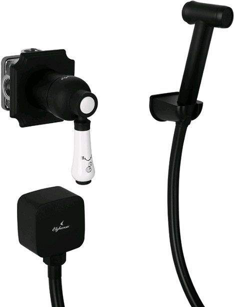 Лейка чёрного цвета выполнена из латуни, шланг черного цвета выполнен из силикона, декоративная панель из металла, рукоять смесителя из керамики