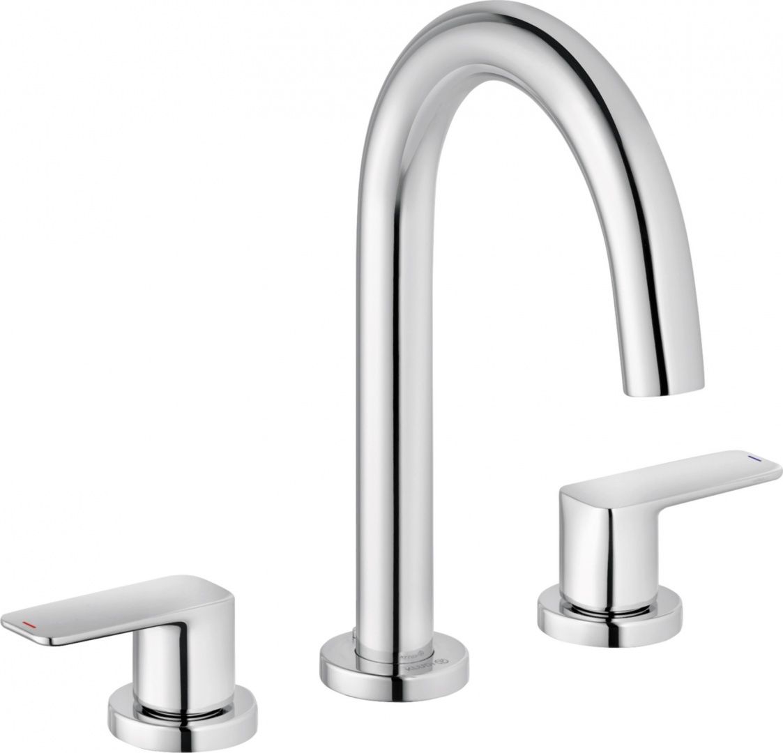 Смеситель Kludi Pure & Style – функциональное устройство для монтажа на раковину. Благодаря системе быстрого монтажа хромированный латунный корпус легко устанавливается в 3 отверстия с помощью гибкой подводки, входящей в комплект. Главным рабочим механизмом служат керамические кран-буксы, открывающие подачу воды при повороте на 90°. Для максимально точной установки температуры и напора подаваемого потока служат удобные для захвата вентили. Донный клапан запирает сливное отверстие, позволяя набрать в раковину воды.