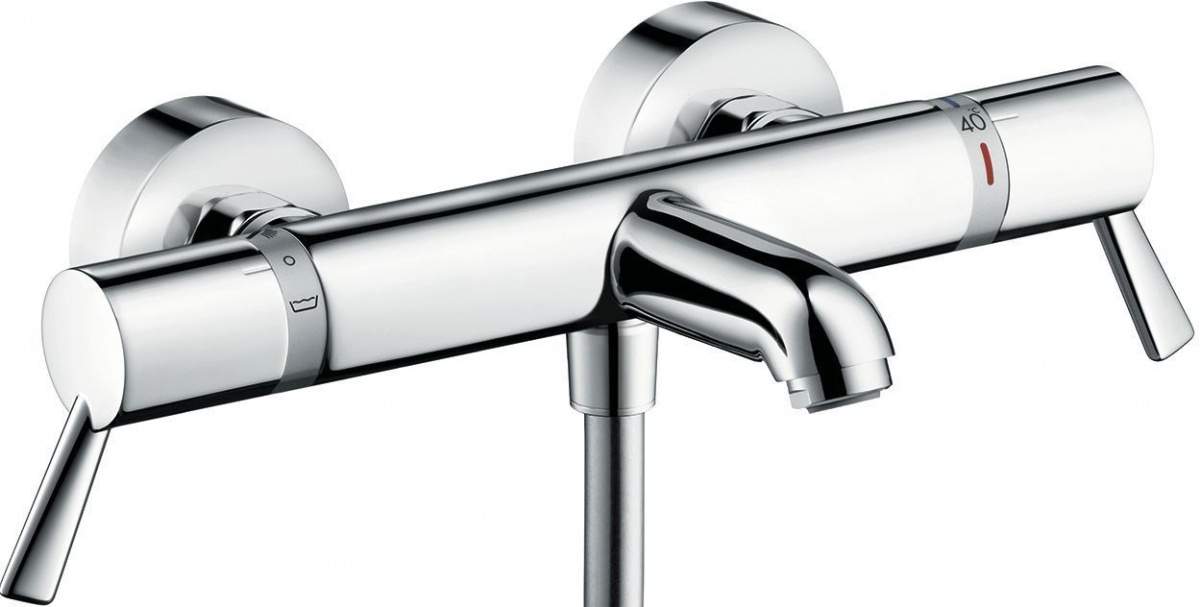 Современный термостат для ванны с душем выполнен из самого популярного для изготовления сантехнических устройств материала – латуни. Его поверхность покрыта тонким слоем металла цвета хром. Оборудование рассчитано на двух потребителей. Управление прибором осуществляется с помощью вентиля. Предохранительный ограничитель температуры горячей воды на 40 °C сводит риск ожогов к минимуму. Термостат снабжен эксцентриками – металлическими переходниками для соединения с водопроводом. За прибором легко ухаживать – его глянцевую поверхность достаточно протереть салфеткой.