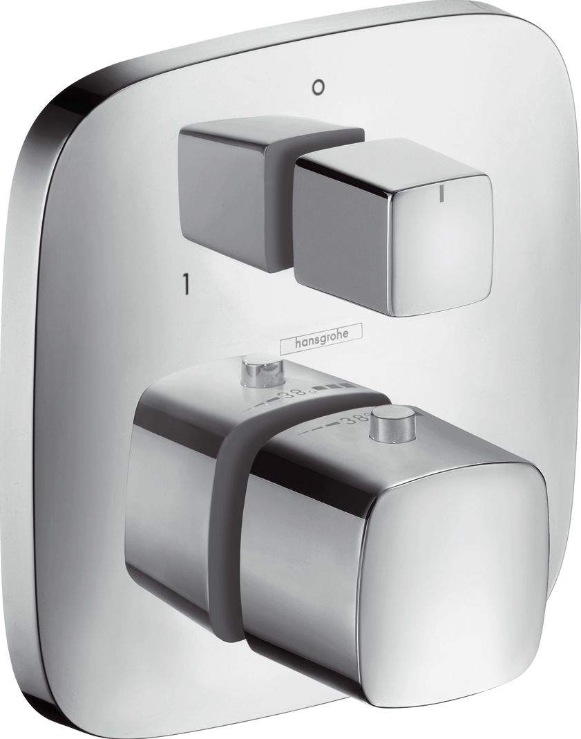 Ультрасовременный термостат PuraVida от немецкой компании Hansgrohe выполнен в стиле хай-тек. Его минималистская квадратная форма идеально впишется в интерьер любой ванной комнаты. Модель с запорным и переключающим вентилем встраивают в стену и закрывают хромированной панелью из латуни. Корпус долговечен и легок в уходе. Термостат оснащен двумя эргономичными вентилями. Один из них служит для регулирования напора и температуры воды, а второй выполняет функцию переключателя потоков. Интегрированный термостатический картридж МТС защищает от перепадов температуры.Предустановленное ограничение температуры горячей воды позволит избежать ожогов во время принятия душа. Устройство рассчитано на расход воды 26 л/мин при давлении 3 бара.
