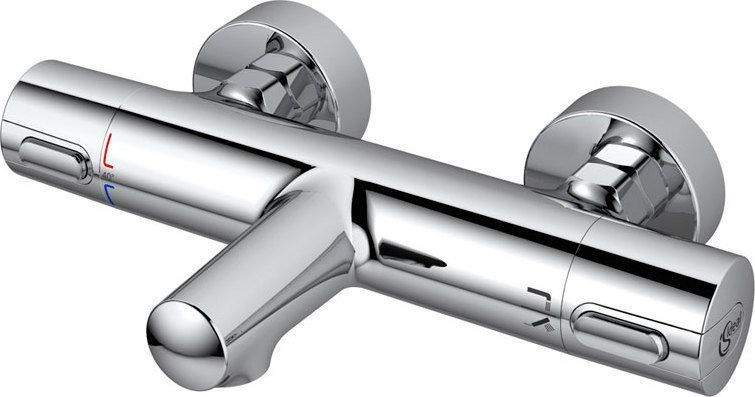 Для автоматического поддержания заданной температуры воды подойдет термостат Ideal Standard Ceratherm 100 New A4623AA. В литом корпусе находится термостатический картридж, выполненный по новой технологии. Управление происходит с помощью двух пластиковых вентилей: один оснащен ограничителем температуры (40 °C), второй может снизить интенсивность потока на 50% для экономии ресурсов. Переключатель режимов ванна/душ интегрирован в рукоятку регулировки напора. Для получения мягкой струи излив оборудован скрытым аэратором Cache M24x1.
