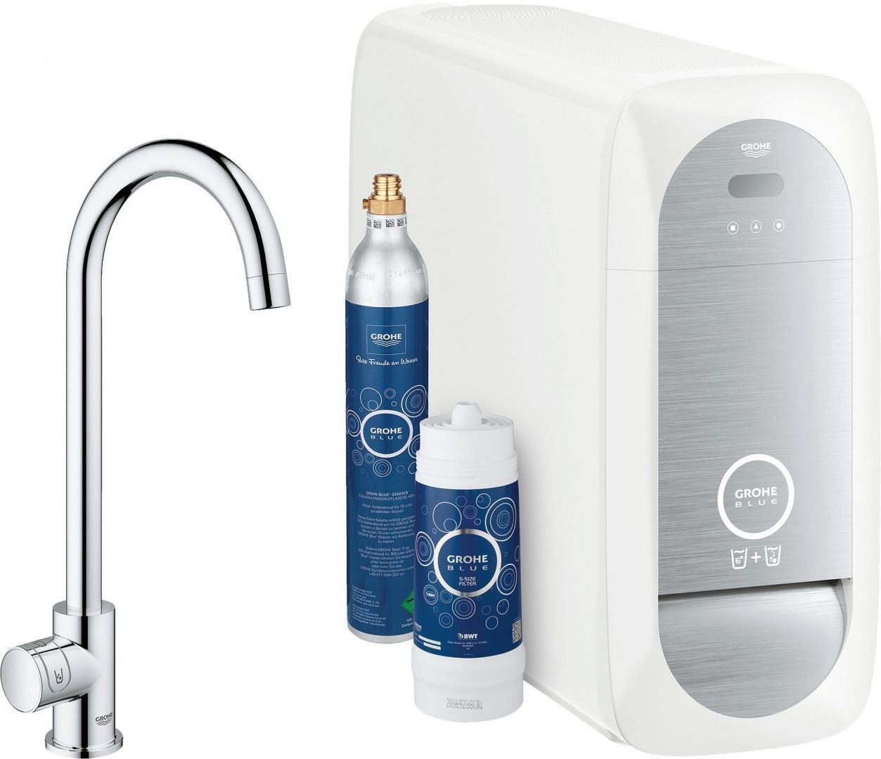 Забудьте хлопоты, связанные с покупкой бутилированной воды. Ведь Вы можете стать обладателем своей собственной системы фильтрации, которая является экологически устойчивым и удобным источником воды в домашних условиях. Стартовый комплект GROHE Blue Home Mono имеет все необходимое, чтобы Вы могли наслаждаться фильтрованной, охлаждённой или газированной водой без отходов в виде пластиковых бутылок. Вентиль с изящным дизайном был создан, чтобы стать идеальным дополнением уже установленного смесителя. Недорогой комплект включает в себя вентиль GROHE Blue и низкоэнергетический (0,5 кВ/ч) домашний блок охлаждения, в котором находятся фильтр и CO2 баллон для газирования. Блок охлаждения можно установить в любой шкаф шириной более 30 см - это делает его идеальным решением для любой кухни, а фильтр и баллон CO2 легко заменяемыми. С помощью нажатия на светящуюся LED-ручку Вы легко сможете выбрать фильтрованную, охлаждённую или газированную воду. Вентилем легко пользоваться - также, как и Вашим смартфоном. LED-экран также покажет Вам, когда необходимо заменить фильтр. Высокий C-образный излив идеально подходит для простого наполнения графинов и кофейников. Созданный в лучших традициях GROHE, этот смеситель для кухни обладает хромированным покрытием GROHE StarLight. Кроме того, установка комплекта чрезвычайно проста - она займёт всего полчаса, а профессиональная помощь при установке и вовсе не понадобится.